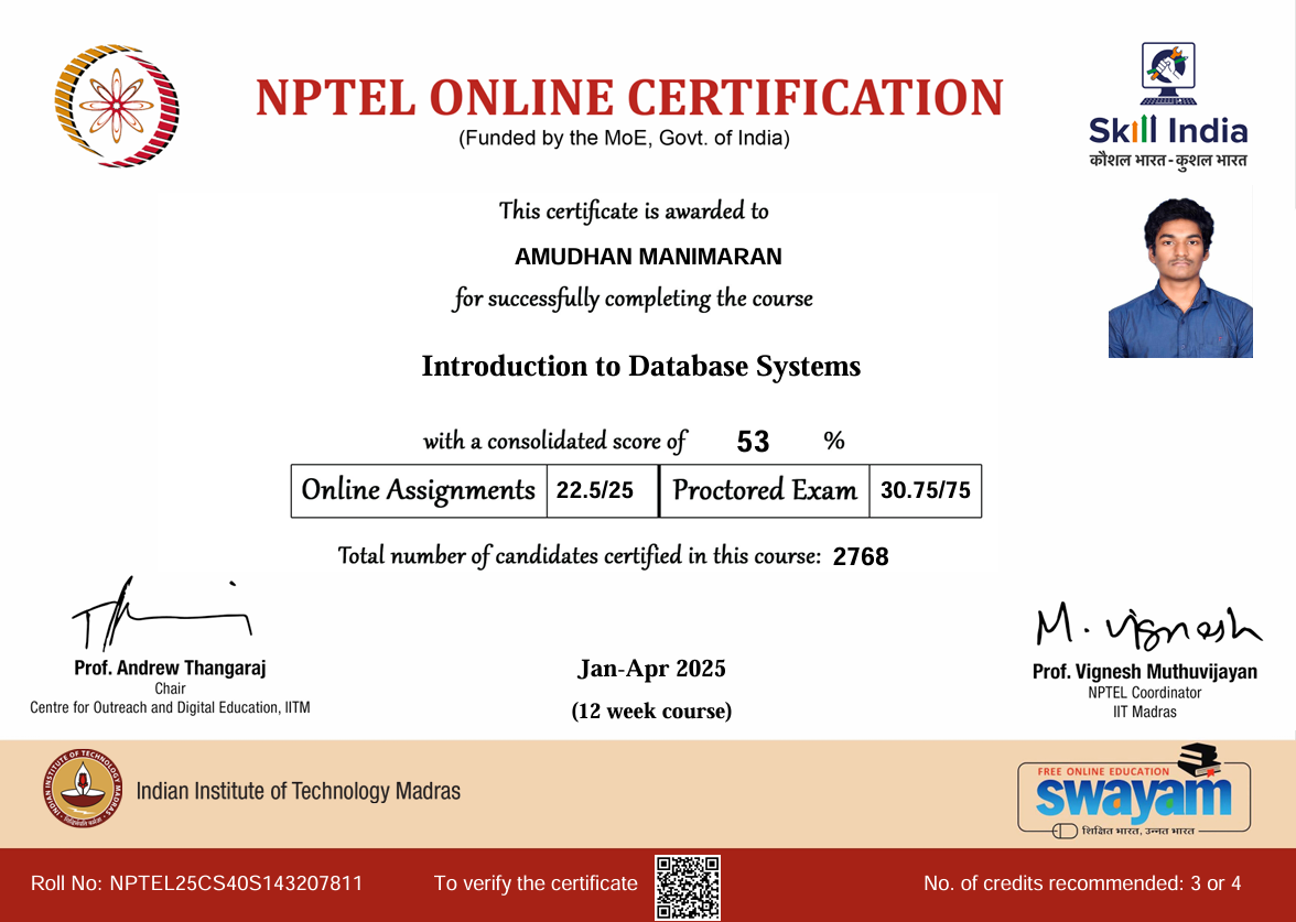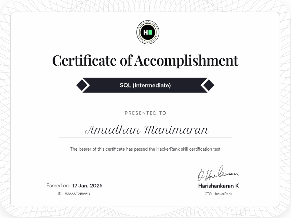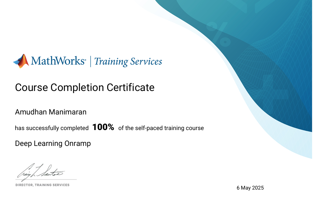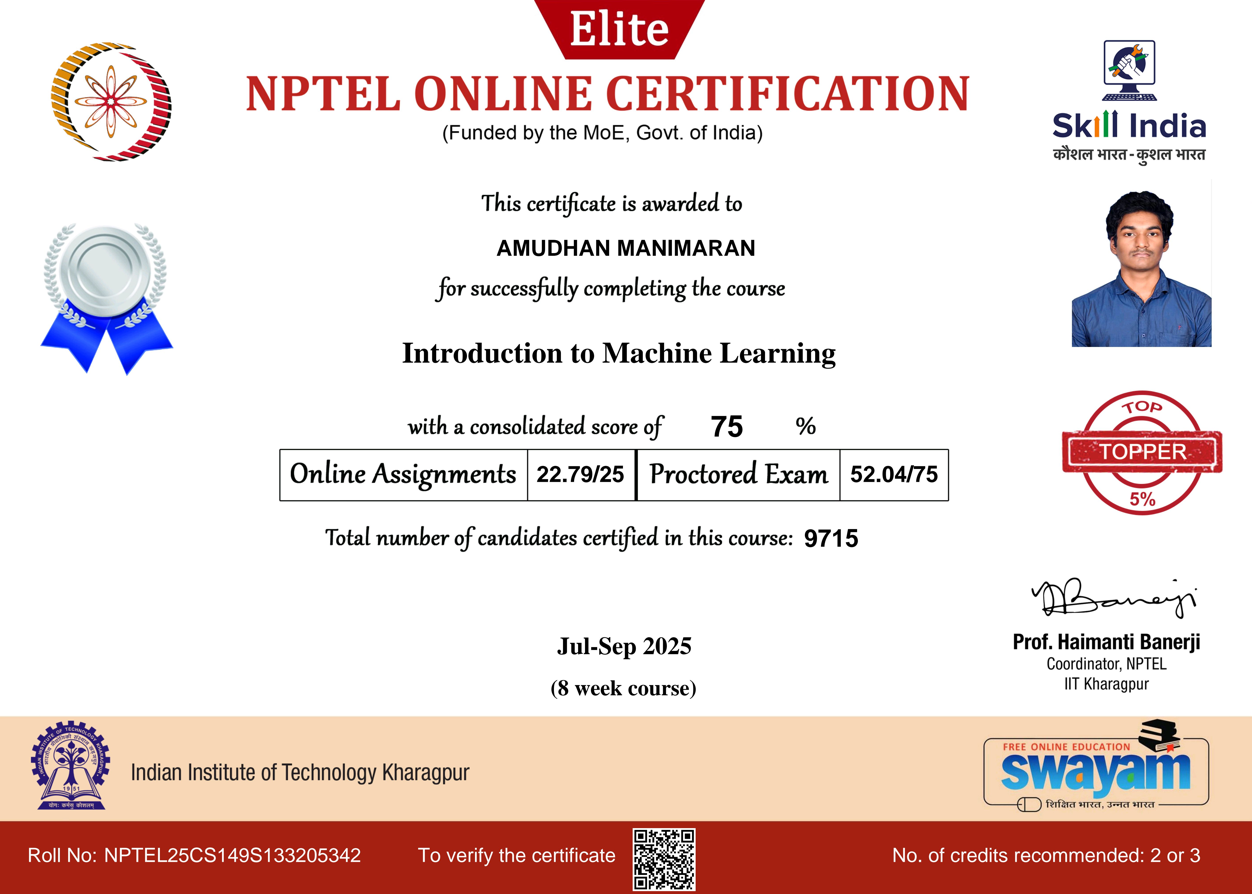 I am Amudhan Manimaran, a third-year B.Tech student specializing in Artificial Intelligence and Machine Learning at SRMIST - Kattankulathur Campus (CGPA: 8.87/10). My research is centered on unsupervised machine learning, computer vision, and principled evaluation methodology — areas where I believe mathematical rigor and real-world applicability must go hand in hand. My research journey began at NIT Tiruchirappalli, where I worked as a Research Intern on affective computing - developing an unsupervised pipeline to model emotional responses in visual art through color science and psychological theory. This work led to the derivation of a novel evaluation metric, Weighted Emotion Accuracy (WEA), achieving 90.3% accuracy in ablation studies. Two first-authored papers from this research are currently under review at Signal, Image and Video Processing, Springer Nature. A third paper on hierarchical plant disease detection using MobileNetV2 has been accepted at ICCET 2026 (Scopus Indexed) and is in press in a Springer Nature edited volume on AI in Agriculture. Beyond research, I ranked in the Top 5% (NPTEL Topper) among 9,715 candidates in Introduction to Machine Learning at IIT Kharagpur, and was selected among the Top 80 candidates at SRMIST KTR for Samsung Innovation Campus - a nationally competitive industry training program under Samsung R&D Bangalore. I build ML systems that span healthcare diagnostics, agricultural intelligence, and renewable energy modeling - always prioritizing reproducibility, mathematical transparency, and research-grade evaluation. I am actively seeking research internship opportunities where I can contribute to high-impact ML research under academic mentorship.