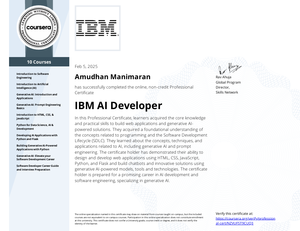 "A testament to my commitment to continuous learning and professional growth, these certifications showcase my expertise and dedication to excelling in the fields of AI, machine learning, and software development."
