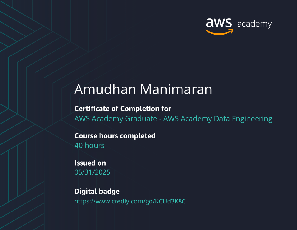 - Successfully achieved AWS-specific certifications while applying theoretical knowledge to simulated enterprise data scenarios.